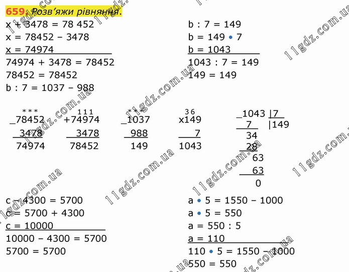 Розв’яжи рівняння. х + 3478 = 78 452 х = 78452 – 3478 х = 74974__________ 74974 + 3478 = 78452 78452 = 78452 b : 7 = 1037 – 988 b : 7 = 149 b = 149 • 7 b = 1043_____ 1043 : 7 = 149 149 = 149 с – 4300 = 5700 с = 5700 + 4300 с = 10000_________ 10000 – 4300 = 5700 5700 = 5700 a • 5 = 1550 – 1000 а • 5 = 550 а = 550 : 5 а = 110___________ 110 • 5 = 1550 – 1000 550 = 550