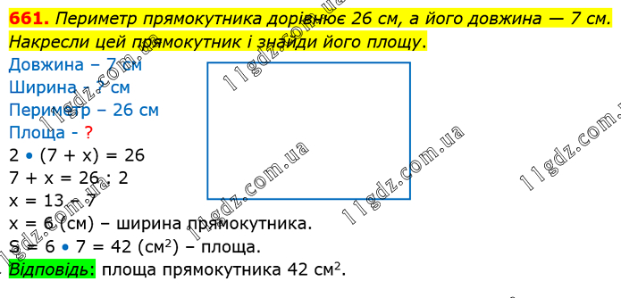 Периметр прямокутника дорівнює 26 см, а його довжина — 7 см. Накресли цей прямокутник і знайди його площу. Довжина – 7 см Ширина - ? см Периметр – 26 см Площа - ? 2 • (7 + х) = 26 7 + х = 26 : 2 х = 13 – 7 х = 6 (см) – ширина прямокутника. S = 6 • 7 = 42 (см2) – площа. Відповідь: площа прямокутника 42 см2.