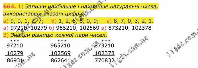 1) Запиши найбільше і найменше натуральні числа, використавши вказані цифри. а) 9, 0, 1, 2, 7; б) 1, 2, 5, 6, 0, 9; в) 8, 7, 0, 3, 2, 1. а) 97210, 10279 б) 965210, 102569 в) 873210, 102378 2) Знайди різницю кожної пари чисел.