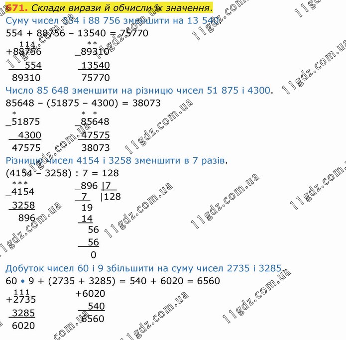 Склади вирази й обчисли їх значення. Суму чисел 554 і 88 756 зменшити на 13 540. 554 + 88756 – 13540 = 75770 Число 85 648 зменшити на різницю чисел 51 875 і 4300. 85648 – (51875 – 4300) = 38073 Різницю чисел 4154 і 3258 зменшити в 7 разів. (4154 – 3258) : 7 = 128 Добуток чисел 60 і 9 збільшити на суму чисел 2735 і 3285. 60 • 9 + (2735 + 3285) = 540 + 6020 = 6560