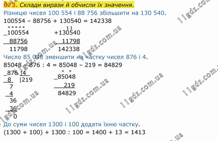 Склади вирази й обчисли їх значення. Різницю чисел 100 554 і 88 756 збільшити на 130 540. 100554 – 88756 + 130540 = 142338 Число 85 048 зменшити на частку чисел 876 і 4. 85048 – 876 : 4 = 85048 – 219 = 84829 До суми чисел 1300 і 100 додати їхню частку. (1300 + 100) + 1300 : 100 = 1400 + 13 = 1413