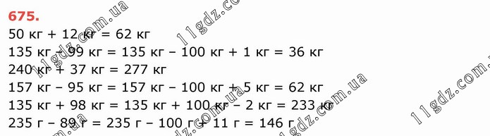 50 кг + 12 кг = 62 кг 135 кг – 99 кг = 135 кг – 100 кг + 1 кг = 36 кг 240 кг + 37 кг = 277 кг 157 кг – 95 кг = 157 кг – 100 кг + 5 кг = 62 кг 135 кг + 98 кг = 135 кг + 100 кг – 2 кг = 233 кг 235 г – 89 г = 235 г – 100 г + 11 г = 146 г