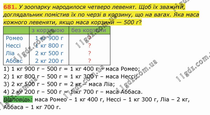 У зоопарку народилося четверо левенят. Щоб їх зважити, доглядальник помістив їх по черзі в корзину, що на вагах. Яка маса кожного левеняти, якщо маса корзини — 500 г? з корзиною без корзини Ромео Нессі Ліа Аббас 1 кг 900 г 1 кг 800 г 2 кг 500 г 2 кг 200 г ? ? ? ? 1) 1 кг 900 г – 500 г = 1 кг 400 г – маса Ромео; 2) 1 кг 800 г – 500 г = 1 кг 300 г – маса Нессі; 3) 2 кг 500 г – 500 г = 2 кг – маса Ліа; 4) 2 кг 200 г – 500 г = 1 кг 700 г – маса Аббаса. Відповідь: маса Ромео – 1 кг 400 г, Нессі – 1 кг 300 г, Ліа – 2 кг, Аббаса – 1 кг 700 г.