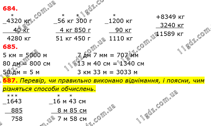 4320 кг - 40 кг = 4280 кг 56 кг 300 г - 4 кг 850 г = 51 кг 450 г 1200 кг - 90 кг = 1110 кг 8349 кг + 3240 кг = 11589 кг 685. 5 км = 5000 м 80 дм = 800 см 50 дм = 5 м 7 дм 7 мм = 707 мм 13 м 40 см = 1340 см 3 км 33 м = 3033 м 687. Перевір, чи правильно виконано віднімання, і поясни, чим різняться способи обчислень. 1643 - 885 = 758 16м 43 см - 8 м 85 см = 7 м 58 см