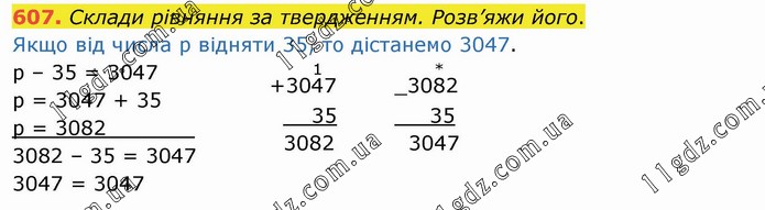Склади рівняння за твердженням. Розв’яжи його. Якщо від числа p відняти 35, то дістанемо 3047. р – 35 = 3047 р = 3047 + 35 р = 3082_______ 3082 – 35 = 3047 3047 = 3047