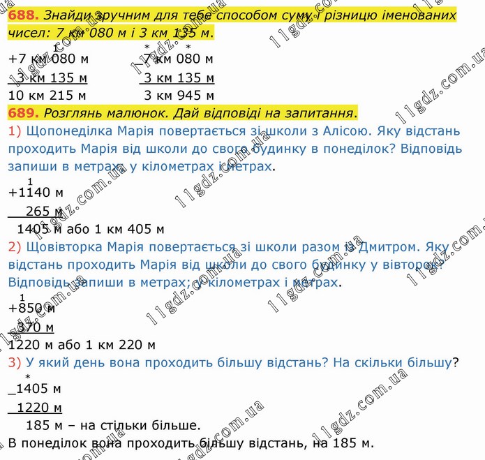 Знайди зручним для тебе способом суму і різницю іменованих чисел: 7 км 080 м і 3 км 135 м. +7 км 0(1)80 м 3 км 135 м _7(*) км 08(*)0 м 3 км 135 м Розглянь малюнок. Дай відповіді на запитання. 1) Щопонеділка Марія повертається зі школи з Алісою. Яку відстань проходить Марія від школи до свого будинку в понеділок? Відповідь запиши в метрах; у кілометрах і метрах.