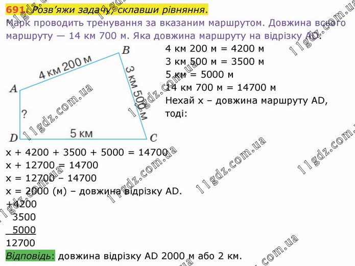Розв’яжи задачу, склавши рівняння. Марк проводить тренування за вказаним маршрутом. Довжина всього маршруту — 14 км 700 м. Яка довжина маршруту на відрізку AD. 4 км 200 м = 4200 м 3 км 500 м = 3500 м 5 км = 5000 м 14 км 700 м = 14700 м Нехай х – довжина маршруту AD, тоді: х + 4200 + 3500 + 5000 = 14700 х + 12700 = 14700 х = 12700 – 14700 х = 2000 (м) – довжина відрізку AD.