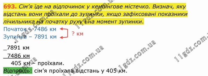 Сім’я їде на відпочинок у кемпінгове містечко. Визнач, яку відстань вони проїхали до зупинки, якщо зафіксовані показники лічильника на початку руху і на момент зупинки. Початок – 7486 км Зупинка – 7891 км