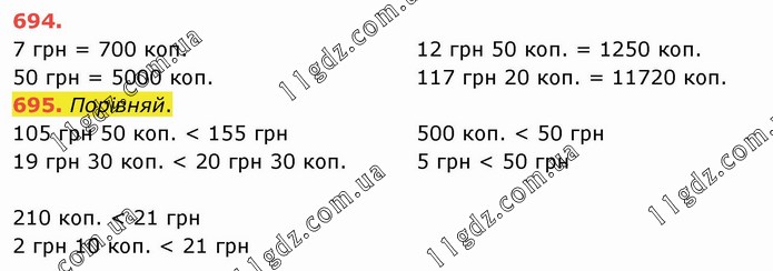 7 грн = 700 коп. 50 грн = 5000 коп. 12 грн 50 коп. = 1250 коп. 117 грн 20 коп. = 11720 коп. 695. Порівняй. 105 грн 50 коп. < 155 грн 19 грн 30 коп. < 20 грн 30 коп. 500 коп. < 50 грн 5 грн < 50 грн 210 коп. < 21 грн 2 грн 10 коп. < 21 грн