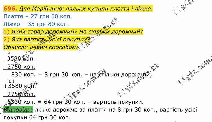 Для Марійчиної ляльки купили плаття і ліжко. Плаття – 27 грн 50 коп. Ліжко – 35 грн 80 коп. 1) Який товар дорожчий? На скільки дорожчий? 2) Яка вартість усієї покупки? Обчисли іншим способом.