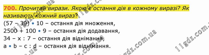 Прочитай вирази. Якою є остання дія в кожному виразі? Як називають кожний вираз? (57 – 39) • 10 – остання дія множення, 2500 + 100 • 9 – остання дія додавання, 34 – х : 7 – остання дія віднімання, a • b – c : d – остання дія віднімання.