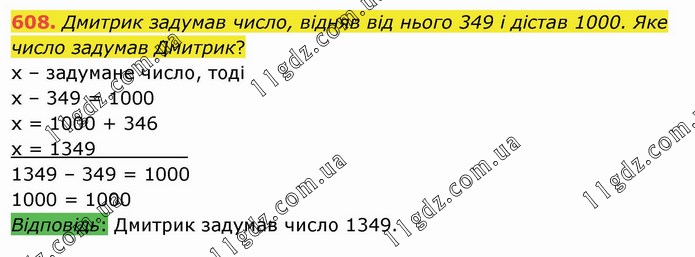 Дмитрик задумав число, відняв від нього 349 і дістав 1000. Яке число задумав Дмитрик? х – задумане число, тоді х – 349 = 1000 х = 1000 + 346 х = 1349________ 1349 – 349 = 1000 1000 = 1000 Відповідь: Дмитрик задумав число 1349.