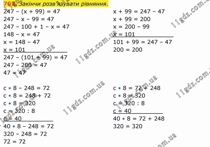 Закінчи розв’язувати рівняння. 247 – (x + 99) = 47 247 – х – 99 = 47 247 – 100 + 1 – х = 47 148 – х = 47 х = 148 – 47 х = 101____________ 247 – (101 + 99) = 47 247 – 200 = 47 47 = 47 х + 99 = 247 – 47 х + 99 = 200 х = 200 – 99 х = 101___________ 101 + 99 = 247 – 47 200 = 200 с • 8 – 248 = 72 с • 8 = 248 + 72 с • 8 = 320 с = 320 : 8 с = 40_________ 40 • 8 – 248 = 72 320 – 248 = 72 72 = 72 с • 8 = 72 + 248 с • 8 = 320 с = 320 : 8 с = 40_________ 40 • 8 = 72 + 248 320 = 320