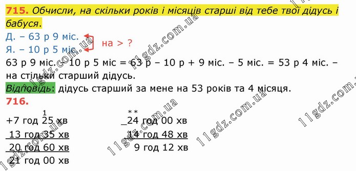 Обчисли, на скільки років і місяців старші від тебе твої дідусь і бабуся. Д. – 63 р 9 міс. Я. – 10 р 5 міс. 63 р 9 міс. – 10 р 5 міс = 63 р – 10 р + 9 міс. – 5 міс. = 53 р 4 міс. – на стільки старший дідусь. Відповідь: дідусь старший за мене на 53 років та 4 місяця.