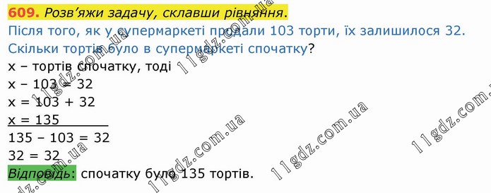Розв’яжи задачу, склавши рівняння. Після того, як у супермаркеті продали 103 торти, їх залишилося 32. Скільки тортів було в супермаркеті спочатку? х – тортів спочатку, тоді х – 103 = 32 х = 103 + 32 х = 135______ 135 – 103 = 32 32 = 32 Відповідь: спочатку було 135 тортів.
