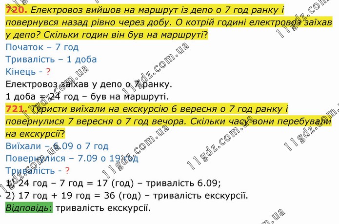 Електровоз вийшов на маршрут із депо о 7 год ранку і повернувся назад рівно через добу. О котрій годині електровоз заїхав у депо? Скільки годин він був на маршруті? Початок – 7 год Тривалість – 1 доба Кінець - ? Електровоз заїхав у депо о 7 ранку. 1 доба = 24 год – був на маршруті. 721. Туристи виїхали на екскурсію 6 вересня о 7 год ранку і повернулися 7 вересня о 7 год вечора. Скільки часу вони перебували на екскурсії? Виїхали – 6.09 о 7 год Повернулися – 7.09 о 19 год Тривалість - ? 1) 24 год – 7 год = 17 (год) – тривалість 6.09; 2) 17 год + 19 год = 36 (год) – тривалість екскурсії. Відповідь: тривалість екскурсії.