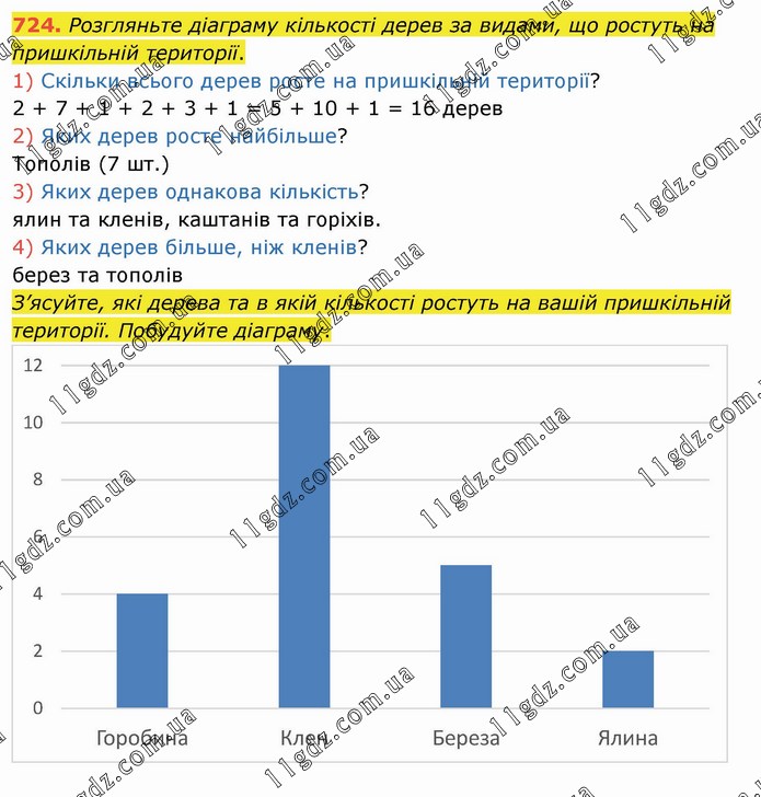 Розгляньте діаграму кількості дерев за видами, що ростуть на пришкільній території. 1) Скільки всього дерев росте на пришкільній території? 2 + 7 + 1 + 2 + 3 + 1 = 5 + 10 + 1 = 16 дерев 2) Яких дерев росте найбільше? Тополів (7 шт.) 3) Яких дерев однакова кількість? ялин та кленів, каштанів та горіхів. 4) Яких дерев більше, ніж кленів? берез та тополів З’ясуйте, які дерева та в якій кількості ростуть на вашій пришкільній території. Побудуйте діаграму.