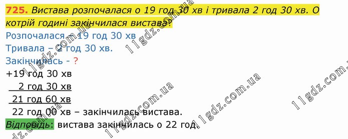 Вистава розпочалася о 19 год 30 хв і тривала 2 год 30 хв. О котрій годині закінчилася вистава? Розпочалася – 19 год 30 хв Тривала – 2 год 30 хв. Закінчилась - ? +19 год 30 хв 2 год 30 хв 21 год 60 хв 22 год 00 хв – закінчилась вистава. Відповідь: вистава закінчилась о 22 год.