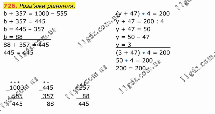 Розв’яжи рівняння. b + 357 = 1000 – 555 b + 357 = 445 b = 445 – 357 b = 88________ 88 + 357 = 445 445 = 445 (y + 47) • 4 = 200 у + 47 = 200 : 4 у + 47 = 50 у = 50 – 47 у = 3___________ (3 + 47) • 4 = 200 50 • 4 = 200 200 = 200