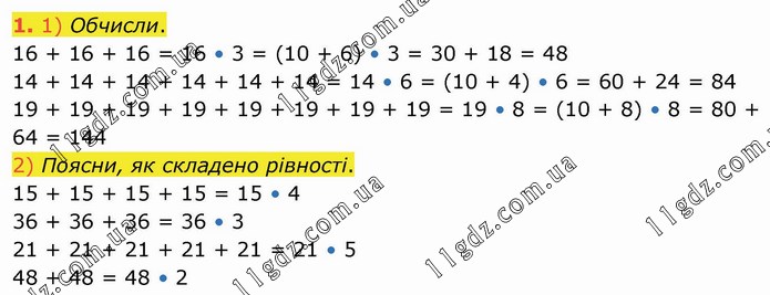 1) Обчисли. 16 + 16 + 16 = 16 • 3 = (10 + 6) • 3 = 30 + 18 = 48 14 + 14 + 14 + 14 + 14 + 14 = 14 • 6 = (10 + 4) • 6 = 60 + 24 = 84 19 + 19 + 19 + 19 + 19 + 19 + 19 + 19 = 19 • 8 = (10 + 8) • 8 = 80 + 64 = 144 2) Поясни, як складено рівності. 15 + 15 + 15 + 15 = 15 • 4 36 + 36 + 36 = 36 • 3 21 + 21 + 21 + 21 + 21 = 21 • 5 48 + 48 = 48 • 2