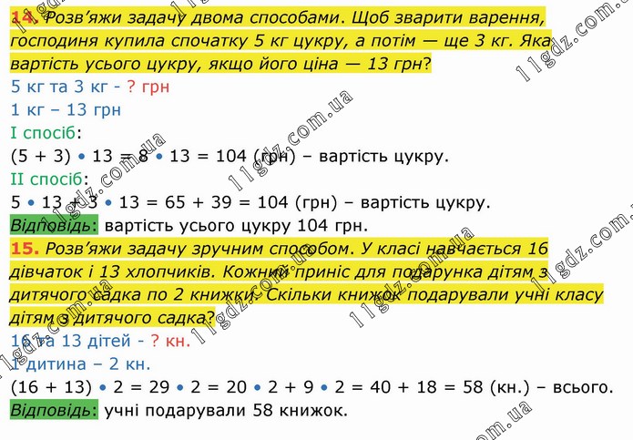 Розв’яжи задачу двома способами. Щоб зварити варення, господиня купила спочатку 5 кг цукру, а потім — ще 3 кг. Яка вартість усього цукру, якщо його ціна — 13 грн? 5 кг та 3 кг - ? грн 1 кг – 13 грн І спосіб: (5 + 3) • 13 = 8 • 13 = 104 (грн) – вартість цукру. ІІ спосіб: 5 • 13 + 3 • 13 = 65 + 39 = 104 (грн) – вартість цукру. Відповідь: вартість усього цукру 104 грн. 15. Розв’яжи задачу зручним способом. У класі навчається 16 дівчаток і 13 хлопчиків. Кожний приніс для подарунка дітям з дитячого садка по 2 книжки. Скільки книжок подарували учні класу дітям з дитячого садка? 16 та 13 дітей - ? кн. 1 дитина – 2 кн. (16 + 13) • 2 = 29 • 2 = 20 • 2 + 9 • 2 = 40 + 18 = 58 (кн.) – всього. Відповідь: учні подарували 58 книжок.