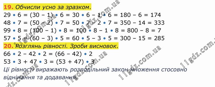 Обчисли усно за зразком. 29 • 6 = (30 – 1) • 6 = 30 • 6 – 1 • 6 = 180 – 6 = 174 48 • 7 = (50 – 2) • 7 = 50 • 7 – 2 • 7 = 350 – 14 = 333 99 • 8 = (100 – 1) • 8 = 100 • 8 – 1 • 8 = 800 – 8 = 7 57 • 5 = (60 – 3) • 5 = 60 • 5 – 3 • 5 = 300 – 15 = 285 20. Розглянь рівності. Зроби висновок. 66 • 2 – 42 • 2 = (66 – 42) • 2 53 • 3 + 47 • 3 = (53 + 47) • 3 Ці рівності виражають розподільний закон множення стосовно віднімання та додавання.