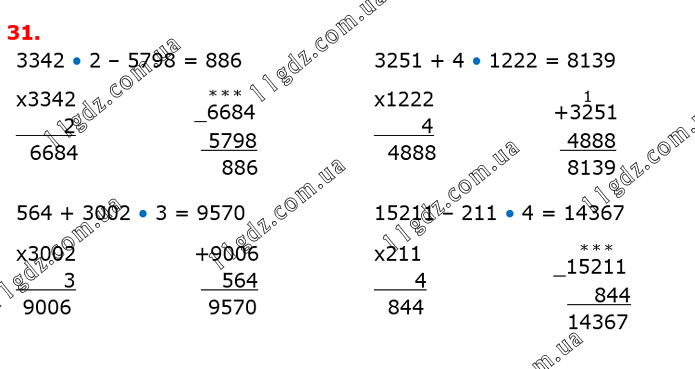 3342 • 2 – 5798 = 886 3251 + 4 • 1222 = 8139 564 + 3002 • 3 = 9570 15211 – 211 • 4 = 14367
