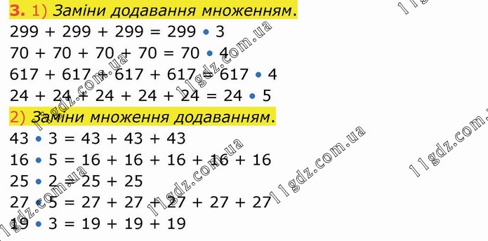 1) Заміни додавання множенням. 299 + 299 + 299 = 299 • 3 70 + 70 + 70 + 70 = 70 • 4 617 + 617 + 617 + 617 = 617 • 4 24 + 24 + 24 + 24 + 24 = 24 • 5 2) Заміни множення додаванням. 43 • 3 = 43 + 43 + 43 16 • 5 = 16 + 16 + 16 + 16 + 16 25 • 2 = 25 + 25 27 • 5 = 27 + 27 + 27 + 27 + 27 19 • 3 = 19 + 19 + 19