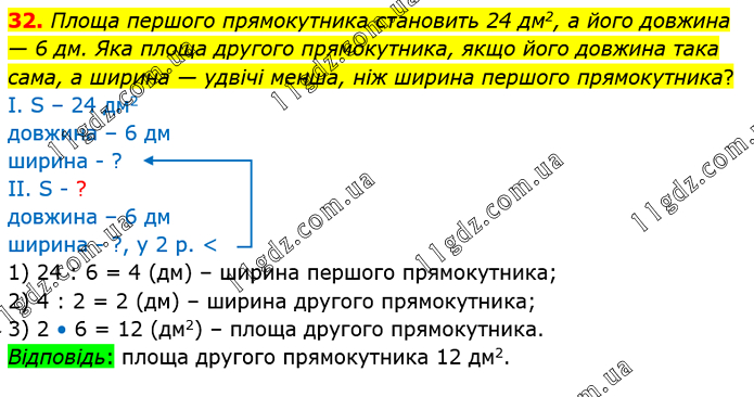 Площа першого прямокутника становить 24 дм2, а його довжина — 6 дм. Яка площа другого прямокутника, якщо його довжина така сама, а ширина — удвічі менша, ніж ширина першого прямокутника? І. S – 24 дм2 довжина – 6 дм ширина - ? ІІ. S - ? довжина – 6 дм ширина - ?, у 2 р. < 1) 24 : 6 = 4 (дм) – ширина першого прямокутника; 2) 4 : 2 = 2 (дм) – ширина другого прямокутника; 3) 2 • 6 = 12 (дм2) – площа другого прямокутника. Відповідь: площа другого прямокутника 12 дм2.