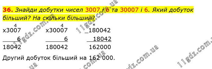 Знайди добутки чисел 3007 і 6 та 30007 і 6. Який добуток більший? На скільки більший?
