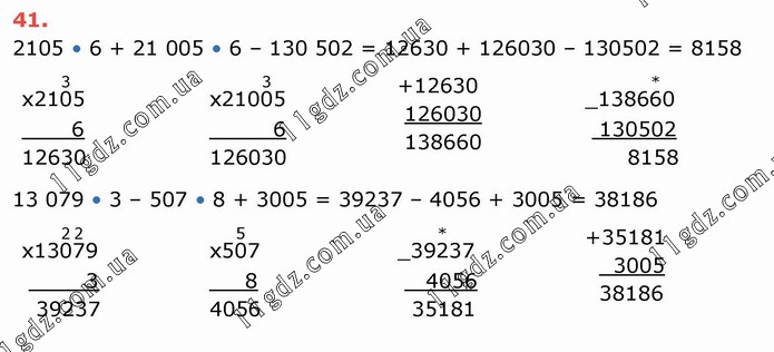 2105 • 6 + 21 005 • 6 – 130 502 = 12630 + 126030 – 130502 = 8158 13 079 • 3 – 507 • 8 + 3005 = 39237 – 4056 + 3005 = 38186