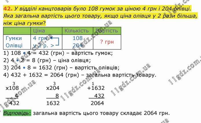 У відділі канцтоварів було 108 гумок за ціною 4 грн і 204 олівці. Яка загальна вартість цього товару, якщо ціна олівця у 2 рази більша, ніж ціна гумки? Ціна Кількість Вартість Гумки Олівці 4 грн у 2 р. > 108 204 ? грн 1) 108 • 4 = 432 (грн) – вартість гумок; 2) 4 • 2 = 8 (грн) – ціна олівця; 3) 204 • 8 = 1632 (грн) – вартість олівців; 4) 432 + 1632 = 2064 (грн) – загальна вартість товару.