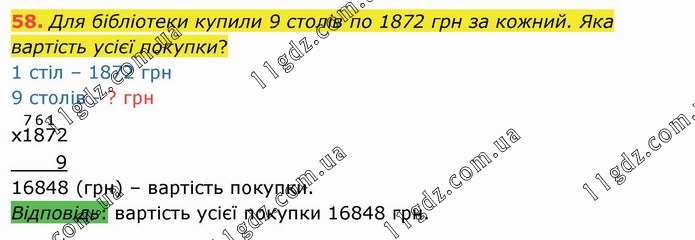 Для бібліотеки купили 9 столів по 1872 грн за кожний. Яка вартість усієї покупки? 1 стіл – 1872 грн 9 столів - ? грн