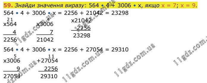 Знайди значення виразу: 564 • 4 + 3006 • х, якщо х = 7; х = 9. 564 • 4 + 3006 • х = 2256 + 21042 = 23298