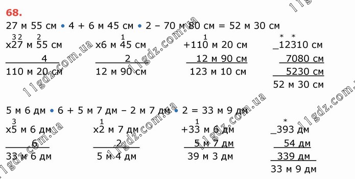 27 м 55 см • 4 + 6 м 45 см • 2 – 70 м 80 см = 52 м 30 см 5 м 6 дм • 6 + 5 м 7 дм – 2 м 7 дм • 2 = 33 м 9 дм