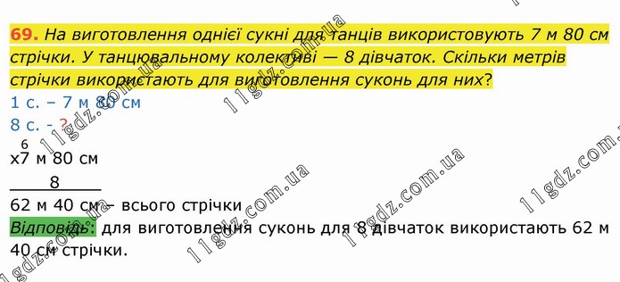 На виготовлення однієї сукні для танців використовують 7 м 80 см стрічки. У танцювальному колективі — 8 дівчаток. Скільки метрів стрічки використають для виготовлення суконь для них? 1 с. – 7 м 80 см 8 с. - ?