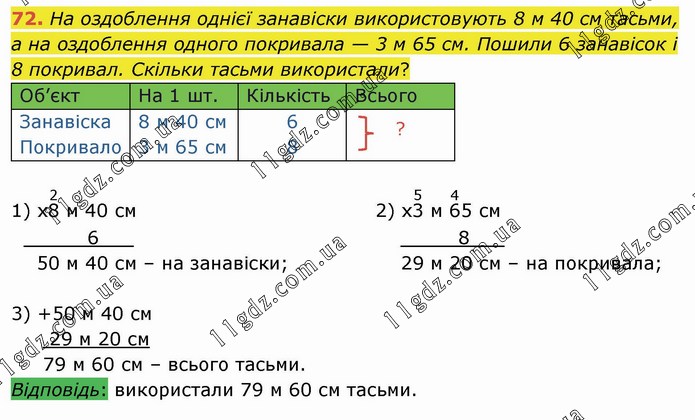 На оздоблення однієї занавіски використовують 8 м 40 см тасьми, а на оздоблення одного покривала — 3 м 65 см. Пошили 6 занавісок і 8 покривал. Скільки тасьми використали?