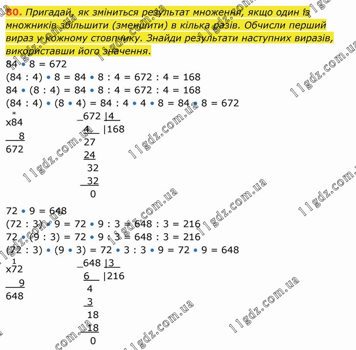 Пригадай, як зміниться результат множення, якщо один із множників збільшити (зменшити) в кілька разів. Обчисли перший вираз у кожному стовпчику. Знайди результати наступних виразів, використавши його значення. 84 • 8 = 672 (84 : 4) • 8 = 84 • 8 : 4 = 672 : 4 = 168 84 • (8 : 4) = 84 • 8 : 4 = 672 : 4 = 168 (84 : 4) • (8 • 4) = 84 : 4 • 4 • 8 = 84 • 8 = 672 72 • 9 = 648 (72 : 3) • 9 = 72 • 9 : 3 = 648 : 3 = 216 72 • (9 : 3) = 72 • 9 : 3 = 648 : 3 = 216 (72 : 3) • (9 • 3) = 72 • 3 : 3 • 9 = 72 • 9 = 648