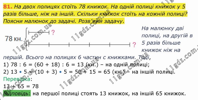 На двох полицях стоїть 78 книжок. На одній полиці книжок у 5 разів більше, ніж на іншій. Скільки книжок стоїть на кожній полиці? Поясни малюнок до задачі. Розв’яжи задачу. На малюнку дві полиці, на другій в 5 разів більше книжок ніж на першій. Всього на полицях 6 частин с книжками. Тоді, 1) 78 : 6 = (60 + 18) : 6 = 13 (кн.) – на одній полиці; 2) 13 • 5 = (10 + 3) • 5 = 50 + 15 = 65 (кн.) – на іншій полиці. Перевірка: 13 + 65 = 78 Відповідь: на першої полиці стоять 13 книжок, на іншій 65 книжок.