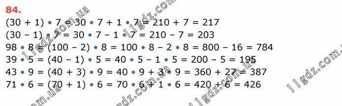 (30 + 1) • 7 = 30 • 7 + 1 • 7 = 210 + 7 = 217 (30 – 1) • 7 = 30 • 7 – 1 • 7 = 210 – 7 = 203 98 • 8 = (100 – 2) • 8 = 100 • 8 – 2 • 8 = 800 – 16 = 784 39 • 5 = (40 – 1) • 5 = 40 • 5 – 1 • 5 = 200 – 5 = 195 43 • 9 = (40 + 3) • 9 = 40 • 9 + 3 • 9 = 360 + 27 = 387 71 • 6 = (70 + 1) • 6 = 70 • 6 + 1 • 6 = 420 + 6 = 426