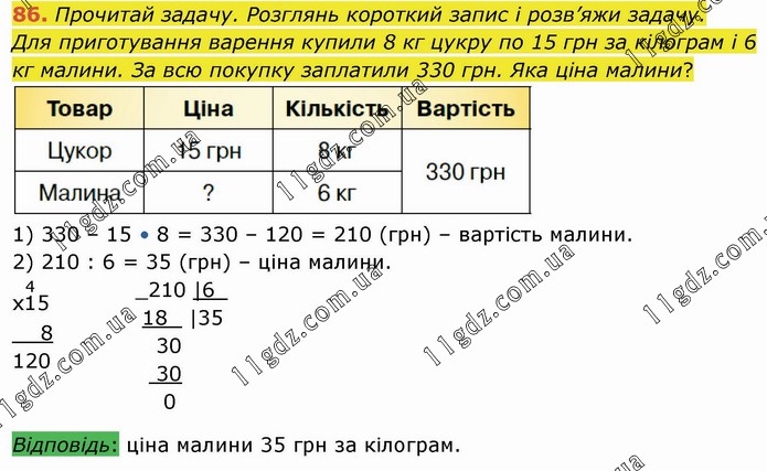 Прочитай задачу. Розглянь короткий запис і розв’яжи задачу. Для приготування варення купили 8 кг цукру по 15 грн за кілограм і 6 кг малини. За всю покупку заплатили 330 грн. Яка ціна малини? 1) 330 – 15 • 8 = 330 – 120 = 210 (грн) – вартість малини. 2) 210 : 6 = 35 (грн) – ціна малини.