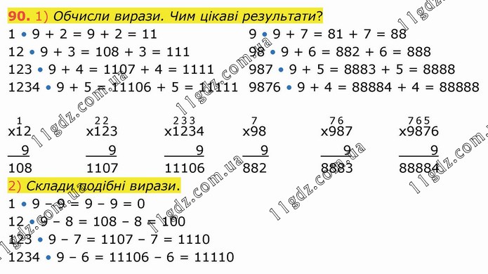 1) Обчисли вирази. Чим цікаві результати? 1 • 9 + 2 = 9 + 2 = 11 12 • 9 + 3 = 108 + 3 = 111 123 • 9 + 4 = 1107 + 4 = 1111 1234 • 9 + 5 = 11106 + 5 = 11111 9 • 9 + 7 = 81 + 7 = 88 98 • 9 + 6 = 882 + 6 = 888 987 • 9 + 5 = 8883 + 5 = 8888 9876 • 9 + 4 = 88884 + 4 = 88888 2) Склади подібні вирази. 1 • 9 – 9 = 9 – 9 = 0 12 • 9 – 8 = 108 – 8 = 100 123 • 9 – 7 = 1107 – 7 = 1110 1234 • 9 – 6 = 11106 – 6 = 11110