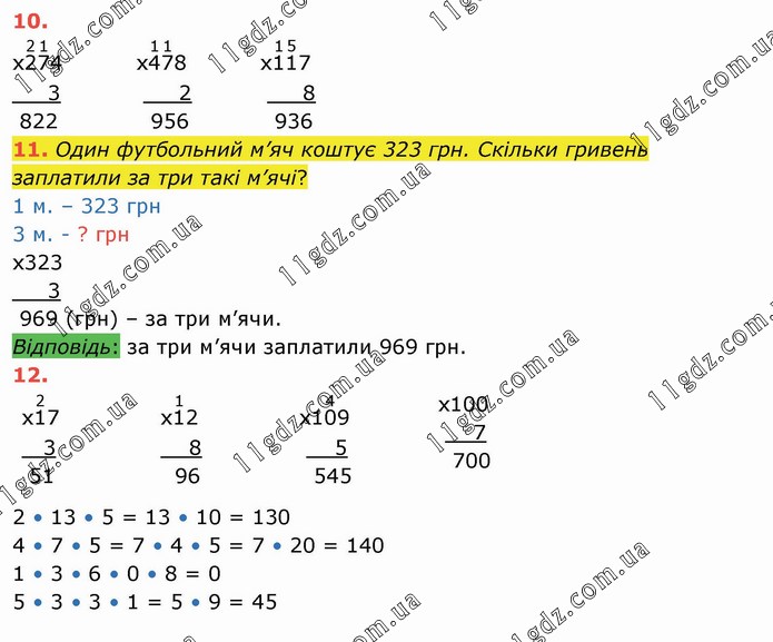 Один футбольний м’яч коштує 323 грн. Скільки гривень заплатили за три такі м’ячі? 2 • 13 • 5 = 13 • 10 = 130 4 • 7 • 5 = 7 • 4 • 5 = 7 • 20 = 140 1 • 3 • 6 • 0 • 8 = 0 5 • 3 • 3 • 1 = 5 • 9 = 45