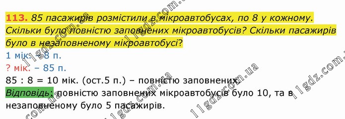 85 пасажирів розмістили в мікроавтобусах, по 8 у кожному. Скільки було повністю заповнених мікроавтобусів? Скільки пасажирів було в незаповненому мікроавтобусі? 1 мік. – 8 п. ? мік. – 85 п. 85 : 8 = 10 мік. (ост.5 п.) – повністю заповнених. Відповідь: повністю заповнених мікроавтобусів було 10, та в незаповненому було 5 пасажирів.