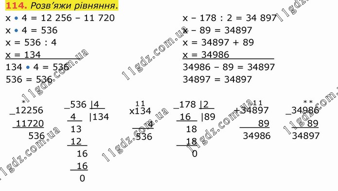 Розв’яжи рівняння. х • 4 = 12 256 – 11 720 х • 4 = 536 х = 536 : 4 х = 134_______ 134 • 4 = 536 536 = 536 х – 178 : 2 = 34 897 х – 89 = 34897 х = 34897 + 89 х = 34986________ 34986 – 89 = 34897 34897 = 34897