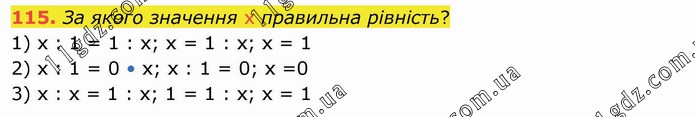 За якого значення х правильна рівність? 1) х : 1 = 1 : х; х = 1 : х; х = 1 2) х : 1 = 0 • х; х : 1 = 0; х =0 3) х : х = 1 : х; 1 = 1 : х; х = 1