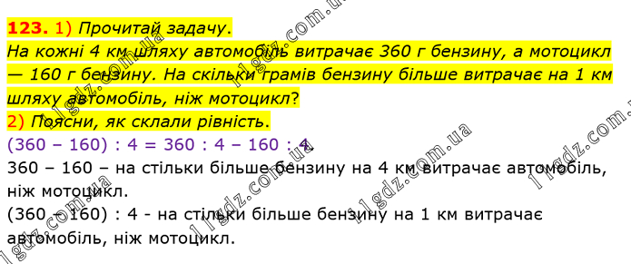 1) Прочитай задачу. На кожні 4 км шляху автомобіль витрачає 360 г бензину, а мотоцикл — 160 г бензину. На скільки грамів бензину більше витрачає на 1 км шляху автомобіль, ніж мотоцикл? 2) Поясни, як склали рівність. (360 – 160) : 4 = 360 : 4 – 160 : 4. 360 – 160 – на стільки більше бензину на 4 км витрачає автомобіль, ніж мотоцикл. (360 – 160) : 4 - на стільки більше бензину на 1 км витрачає автомобіль, ніж мотоцикл.