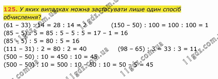 У яких випадках можна застосувати лише один спосіб обчислення? (61 – 33) : 14 = 28 : 14 = 2 (150 – 50) : 100 = 100 : 100 = 1 (85 – 5) : 5 = 85 : 5 – 5 : 5 = 17 – 1 = 16 (85 – 5) : 5 = 80 : 5 = 16 (111 – 31) : 2 = 80 : 2 = 40 (98 – 65) : 3 = 33 : 3 = 11 (500 – 50) : 10 = 450 : 10 = 45 (500 – 50) : 10 = 500 : 10 – 50 : 10 = 50 – 5 = 45