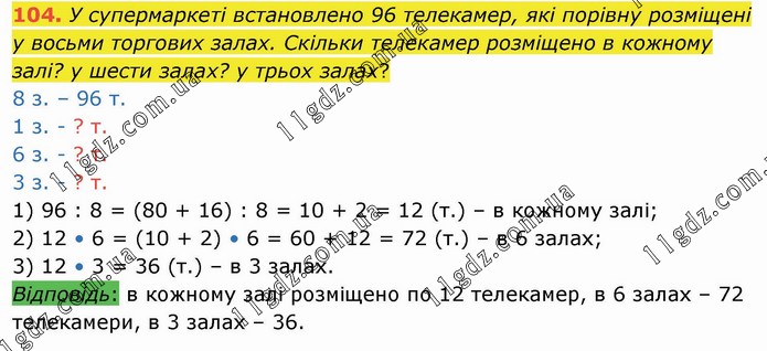 У супермаркеті встановлено 96 телекамер, які порівну розміщені у восьми торгових залах. Скільки телекамер розміщено в кожному залі? у шести залах? у трьох залах? 8 з. – 96 т. 1 з. - ? т. 6 з. - ? т. 3 з. - ? т. 1) 96 : 8 = (80 + 16) : 8 = 10 + 2 = 12 (т.) – в кожному залі; 2) 12 • 6 = (10 + 2) • 6 = 60 + 12 = 72 (т.) – в 6 залах; 3) 12 • 3 = 36 (т.) – в 3 залах. Відповідь: в кожному залі розміщено по 12 телекамер, в 6 залах – 72 телекамери, в 3 залах – 36.