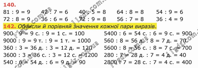81 : 9 = 9 72 : 8 = 9 42 : 7 = 6 36 : 6 = 6 40 : 5 = 8 72 : 9 = 8 64 : 8 = 8 56 : 7 = 8 54 : 9 = 6 36 : 4 = 9 142. Обчисли й порівняй значення кожної пари виразів. 900 : 9 = 9 с. : 9 = 1 с. = 100 9000 : 9 = 9 т. : 9 = 1 т. = 1000 360 : 3 = 36 д. : 3 = 12 д. = 120 3600 : 3 = 36 с. : 3 = 12 с. = 1200 540 : 6 = 54 д. : 6 = 9 д. = 90 5400 : 6 = 54 с. : 6 = 9 с. = 900 560 : 8 = 56 д. : 8 = 7 д. = 70 5600 : 8 = 56 с. : 8 = 7 с. = 700 280 : 7 = 28 д. : 7 = 4 д. = 40 2800 : 7 = 28 с. : 7 = 4 с. = 400
